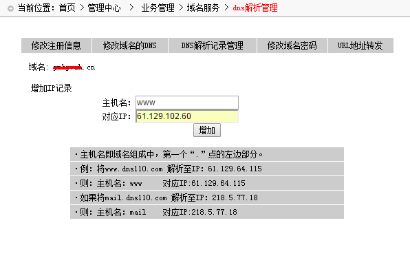 ·主機(jī)名即域名組成中,第一個(gè)“.”點(diǎn)的左邊部分。IP就是您空間的IP地址(一般增加兩條記錄:一條主機(jī)名填WWW,一條為空,對應(yīng)IP為您空間的對應(yīng)IP,如有其他自行增加即可,我司可免費(fèi)做20條解析記錄)