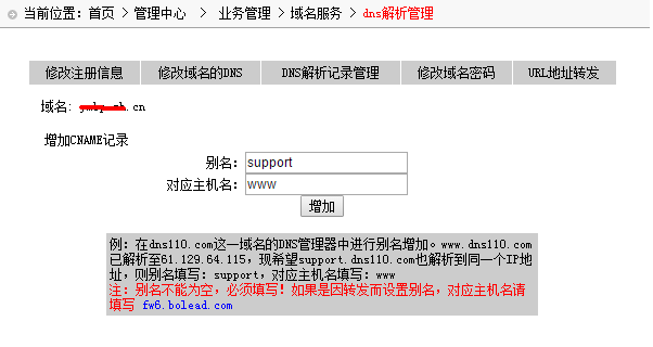 ·請先添加轉(zhuǎn)發(fā)后在dns解析記錄管理中增加別名,對應(yīng)主機(jī)名請?jiān)谧⒁馐马?xiàng)中查看!