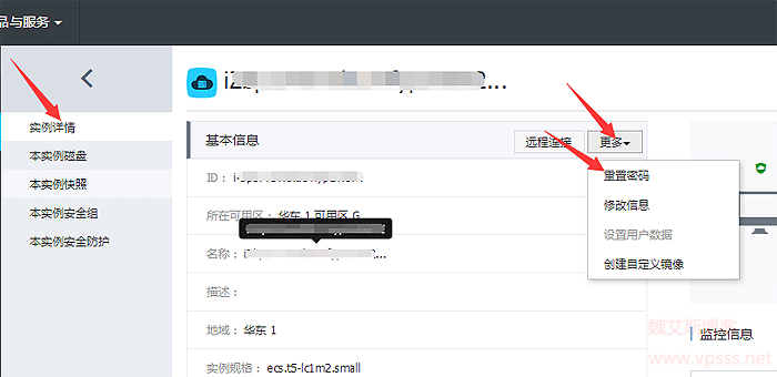 點擊云服務器名字最右側的“管理”>>“實例詳情”>>“更多”>>“重置密碼”,接下來就和第 3 步的操作一樣了。