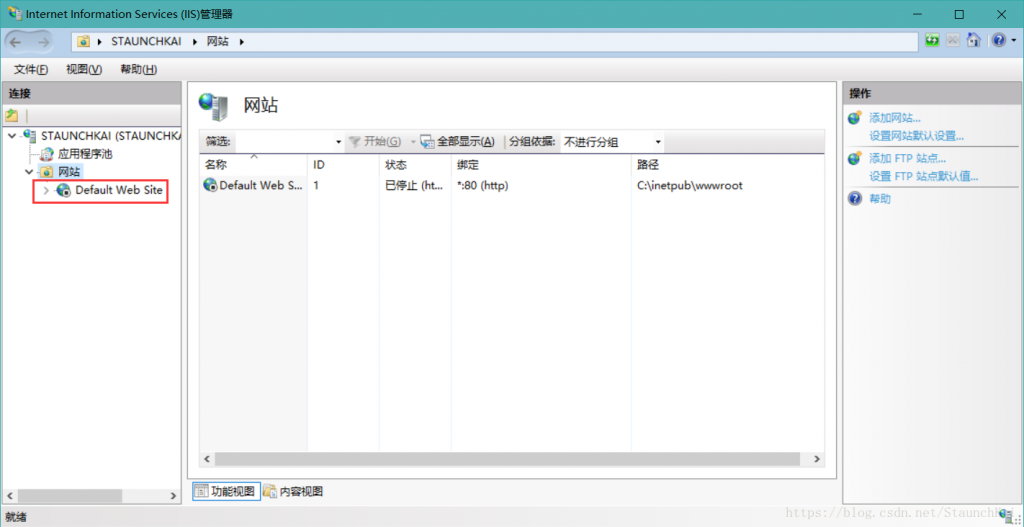 7.選擇默認的站點,點擊右邊高級設(shè)置,可設(shè)置網(wǎng)站的目錄,默認在 C盤已經(jīng)存在一個目錄。