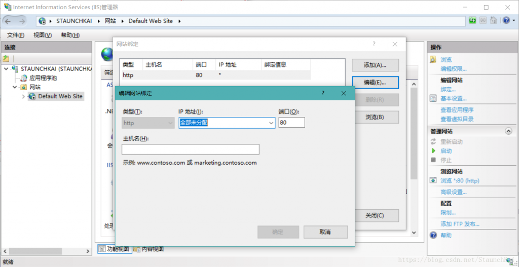 點擊右邊的 綁定,可修改網(wǎng)站的端口等信息。