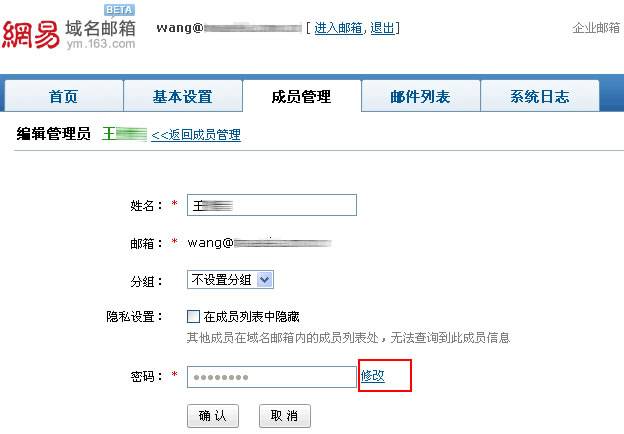 使用管理員帳號,在?http://ym.163.com登錄管理平臺,在“成員管理”頁面的編輯管理員帳號處,修改管理員密碼。