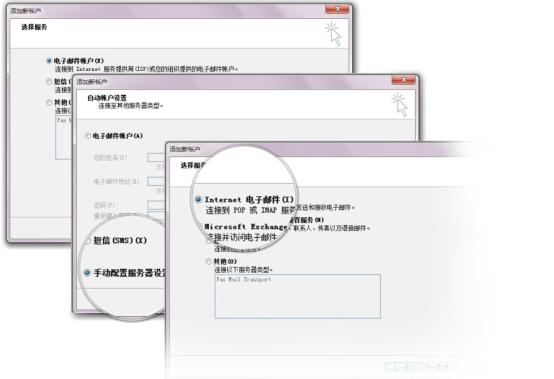 2.1如圖所示,在Outlook中添加賬戶,依次選擇[電子郵件賬戶]-[手動配置服務(wù)期設(shè)置]-[Internet電子郵件]。