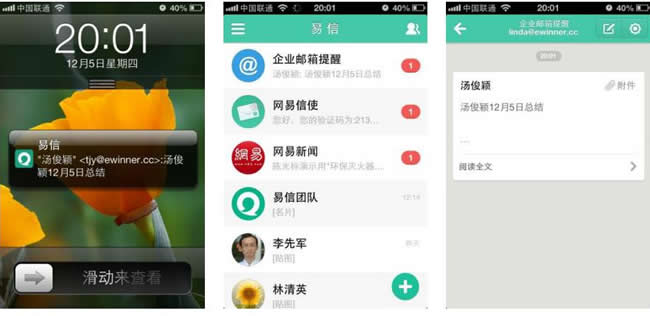 網易企業郵箱綁定易信,可實現 0 延遲的郵件推送,另外還可以直接在易信手 機客戶端查閱、回復發送郵件等功能,另外易信還支持免費短信、免費語音流量, 免費 200 人語音群。方便全員高效辦公,利于客戶及時查閱發送的郵件信函。