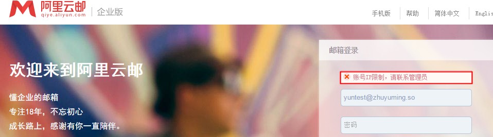 成功設(shè)置IP登錄權(quán)限后,未被允許使用的IP登錄企業(yè)郵箱時(shí),將會(huì)提示如下: