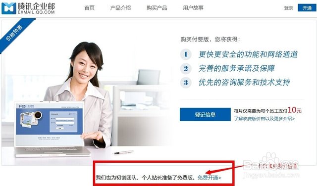 騰訊企業郵免費郵箱,登陸騰訊企業郵箱的網站,網址:http://exmail.qq.com/;點擊頁面右上角【開通】字樣;