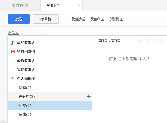 郵件編輯頁面,直接點擊收件人即可打開聯(lián)系人列表,抄送和密送也在相同位置點擊