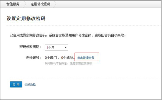 定期修改密碼的周期可設(shè)為1個月、2個月、3個月、6個月和1年。啟用定期修改密保后,系統(tǒng)會在密碼失效前郵件通知成員修改密碼。