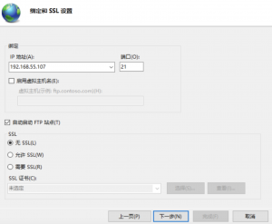 4.站點的地址就寫自己的IP就好,端口21,是ftp控制信號的默認端口,(端口隨意,盡量不要用已經被占用了的端口號)。SSL證書選無,有證書配置起來就很麻煩了。IP盡量配一個,用它推薦的那個吧,我的是192.168.55.107,不能自己隨便設一個,這樣會無法訪問。