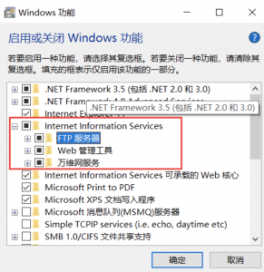 1.在windows系統中先開啟ftp服務:這里Internet信息服務底下的三個包括子項全部需要勾選。點擊確定后,可能會要等一會兒,完成后就可以使用FTP服務了。