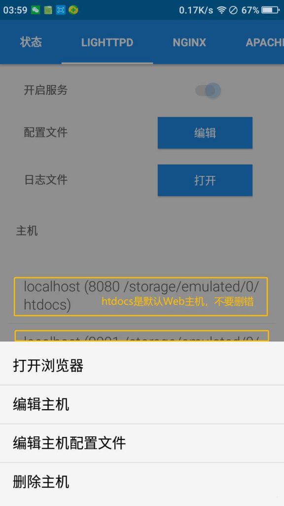 注意,安裝后想要卸載工具是先到LIGHTTPD/NGINX/APACHE選項卡里刪除對應的主機(點擊主機-刪除主機),否則后續容易出現問題。