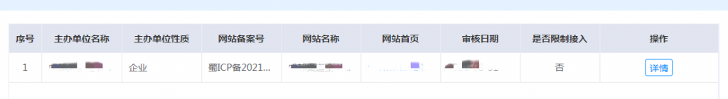 點擊“操作”欄目中的“詳情”按鈕,即可查看ICP備案主體信息、ICP備案網站信息。(注:ICP備案號的開頭為四川省所在省份的簡稱)