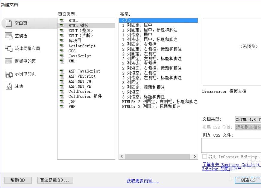 1、剛進(jìn)入dreamweaver點(diǎn)擊新建下方的更多,然后選擇空白頁,頁面類型選擇html模板,布局選無就行了。