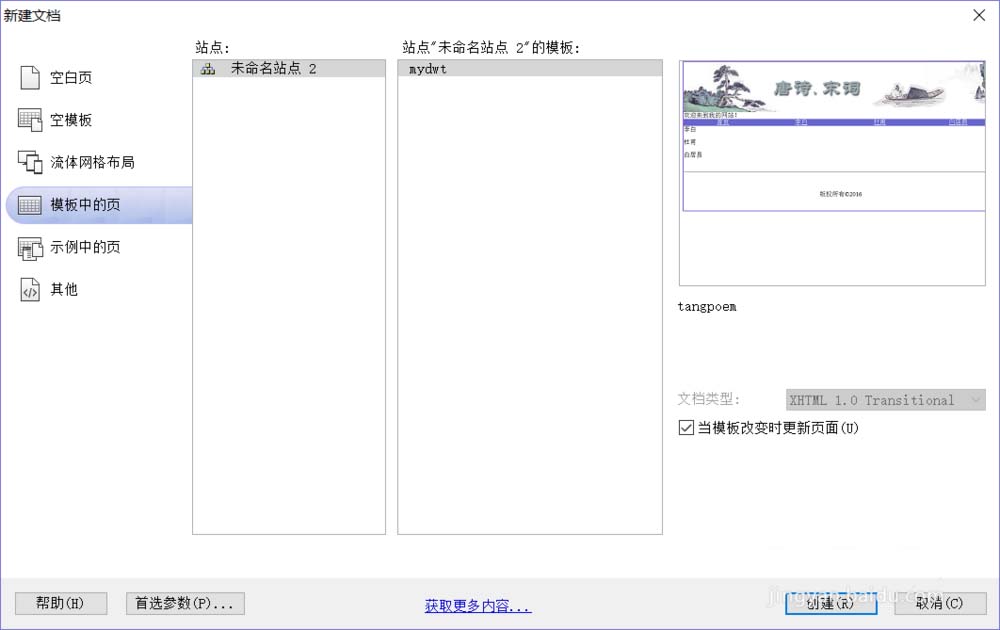 7、新建,模板中的頁,找到新建的模板,創(chuàng)建,保存為index.html,index.html(即網(wǎng)站的主頁),再重新打開新建的模板,在可編輯區(qū)預(yù)報(bào)輸入李白的資料,保存為libai.com,此時(shí)你會(huì)發(fā)現(xiàn)只有在可編輯區(qū)域才能輸入內(nèi)容,其他區(qū)域都是不可操作的,這就是模板的特點(diǎn)。同理,在新建兩個(gè)作為杜甫和白居易的網(wǎng)頁。