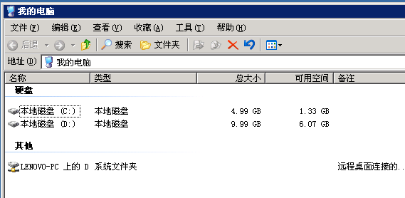 五,登錄進去服務器之后,可以看到服務器的我的電腦里,有了本地電腦的D盤,就可以直接從D盤復制文件到服務器了,如圖所示: