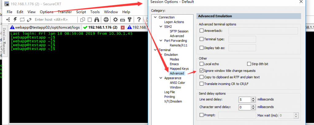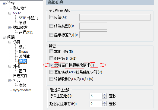 SecureCRT中文版:菜單欄:選項–編輯默認會話–終端-仿真-高級 勾選“忽略窗口標題更改請求”。
