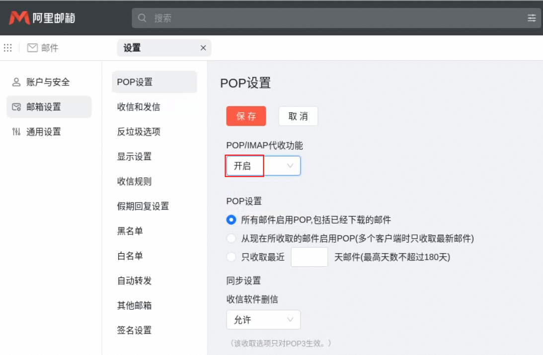 2、進入郵箱設置–POP設置,選擇開啟或關閉POP/IMAP代收功能并保存設置。