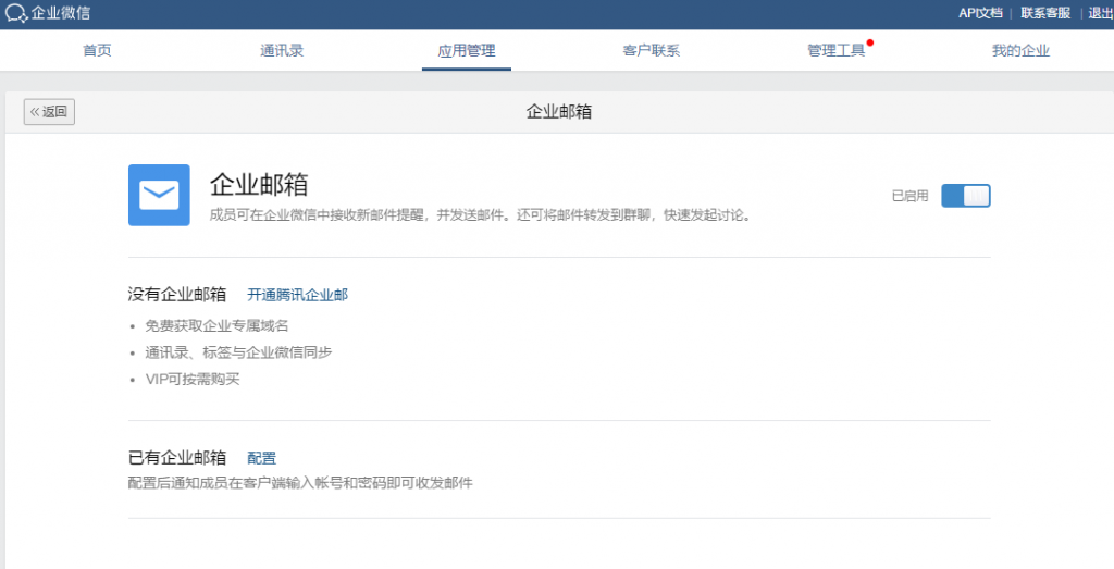 騰訊企業(yè)郵箱已有域名綁定方法:管理員進(jìn)入應(yīng)用管理->企業(yè)郵箱,選擇“已有企業(yè)郵箱”下的“配置”