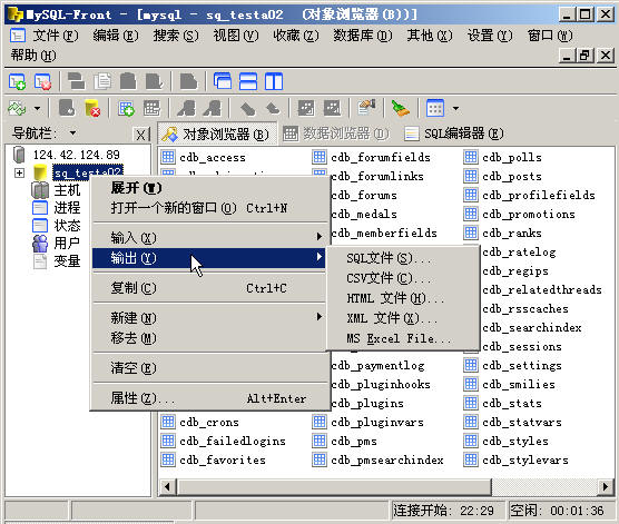7、連接成功后,可以進行很多mysql數據庫的管理工作,可以將數據庫導出保存,可以對表作各種操作